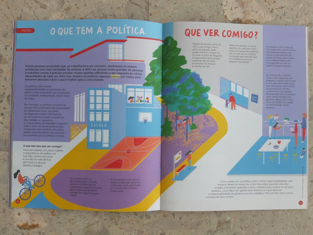 Há anos que tenho vindo a conversar com colegas, amigos e familiares que as crianças e os jovens não podem viver alheados da política; da política sim, não dos partidos políticos, embora haja aqui uma grande relação de proximidade. Uma das coisas que me deixou muito feliz quando fiz 18 anos foi a possibilidade de votar. Este dever cívico sempre me foi incutido pela família. A política é aquilo que gere a nossa vida; é através das políticas que são implementadas que podemos ou não ter acesso a determinadas coisas. É pelo facto da dois pontos se dedicar também à abordagem da política com as crianças que me faz gostar tanto dela. É também no âmbito da Educação para a Cidadania que se abordam pelo menos duas questões que nos levam à política: “a conceção de cidadania ativa e a identificação de competências essenciais de formação cidadã (Competências para uma Cultura da Democracia)”. Ser criança é ir compreendendo, à medida que se cresce, que se faz parte de uma ou de várias comunidades; que se pode contribuir para o bem estar de outros.