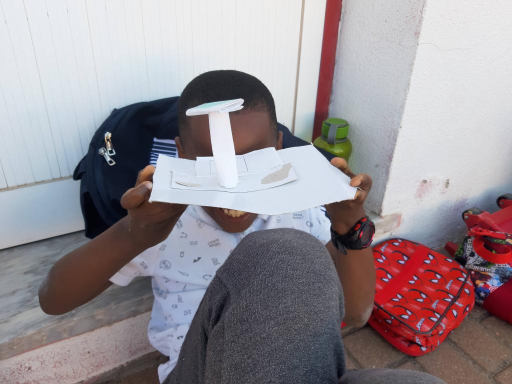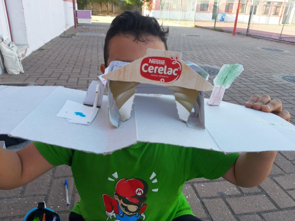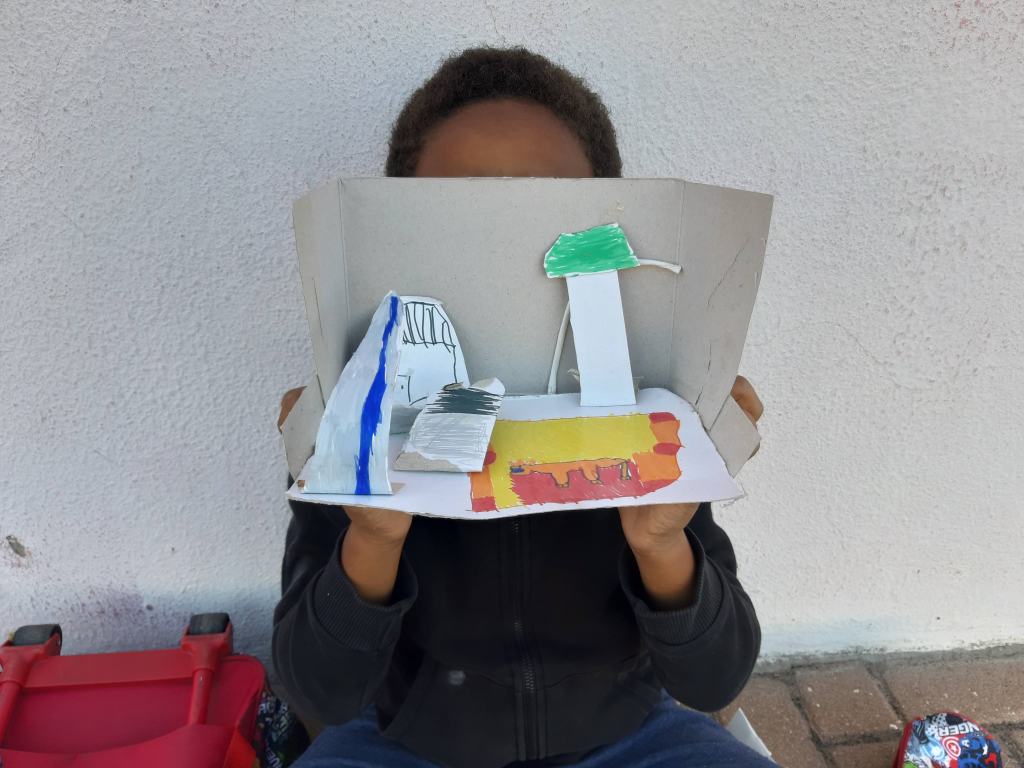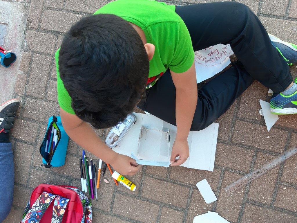 Visto que sou uma adepta do material de desperdício levei uma série de caixas de cartão. Como as crianças trazem sempre o seu próprio material de desgaste (canetas, cola, lápis…), reunimos as condições para que pudessem dar largas à imaginação. Tenho optado por dar as aulas no exterior, não só por estarmos a viver uma pandemia mas também porque acho que é o que as crianças mais precisam após um dia inteiro em sala de aula. Ocupar o espaço exterior é um ato criativo inconsciente, sobretudo quando temos de arranjar formas de estar para conseguir desenhar, recortar, colar…