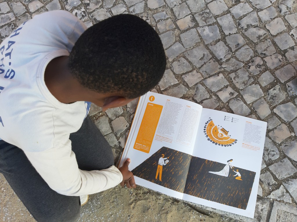 Na semana passada a peça entrou em cena: um drama que envolveu um cavaleiro branco, um ninja, uma rainha e a sua filha princesa, um super-herói e um “matador”. Houve cenas com jogos de luta que me deixaram a refletir sobre como poderei eu apoiar estas crianças a pensar sobre a violência. Este grupo (e um outro onde lecciono Artes Plásticas) tem o pavio curto. Temos conversado sobre as nossas diferenças, sobre o que gostamos e não gostamos. Estes momentos de teatro revelaram-se conciliadores do grupo no sentido em que a luta é de facto a fingir; e foi tão bom poder observar isso e sentir a alegria deles em serem atores da sua própria narrativa. No final do espetáculo senti-os unidos de uma forma que nunca sentido.