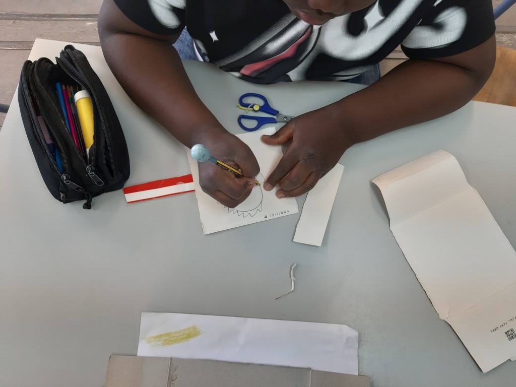 Foi então que me tornei escriba: comecei a escrever o que eles me iam ditando, estavam cheios de ideias para aquela trama. De vez em quando pediam-me para ler tudo, precisavam de saber o ponto de situação da história. Visto que este projeto nos ocupou mais de uma semana, uma das aulas serviu para fazer alguns adereços em cartão como forma de identificar as personagens.