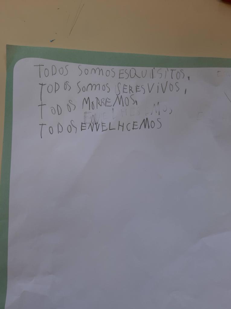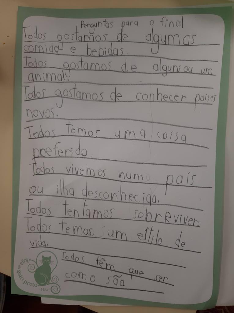 Há pouco tempo, cada um tinha feito o retrato do colega do lado. O olhar estava treinado para descobrir diferenças. Foi neste contexto que introduzi a seguinte questão: todos somos diferentes uns dos outros em muitas coisas. E em que é que somos iguais, já pensaram nisso? Que coisas é que temos em comum? Que coisas é que todos fazemos?
