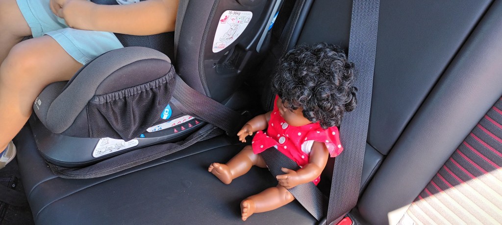 A boneca tem sido personagem viva de várias brincadeiras. Uma das mais recentes esteve relacionada com o cuidar: dar comida, colocar a dormir. O D. pediu para a levar com ele para casa dos avós e eu disse que sim. Referiu que a boneca precisava de cinto e assim fiz. Já com a boneca no carro e de cinto posto disse “não podes sair, não tiras o cinto”, dizendo à boneca o que ele próprio ouve algumas vezes.